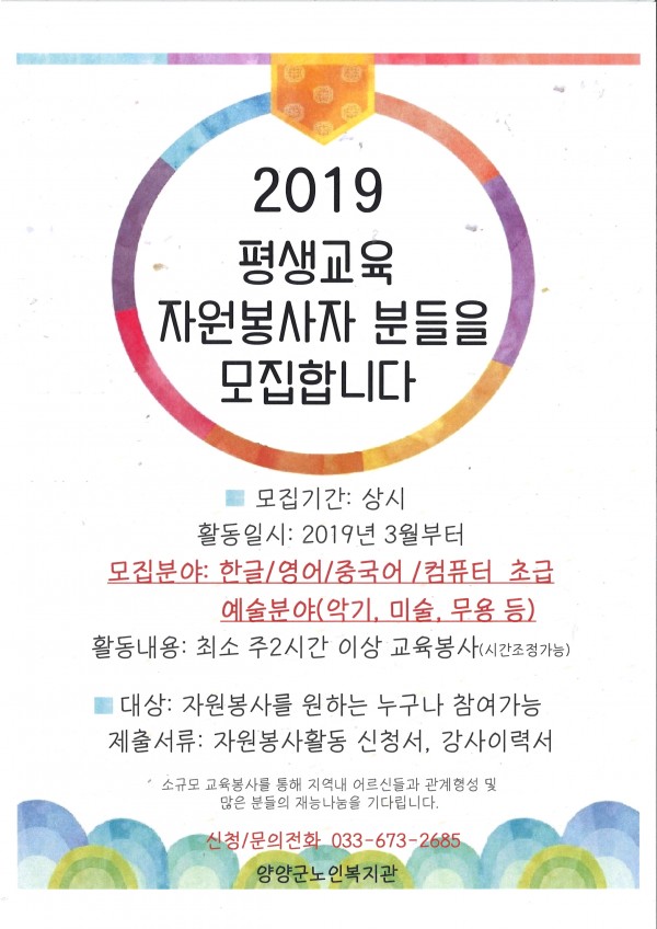 2019 평생교육프로그램 자원봉사자를 모집합니다.