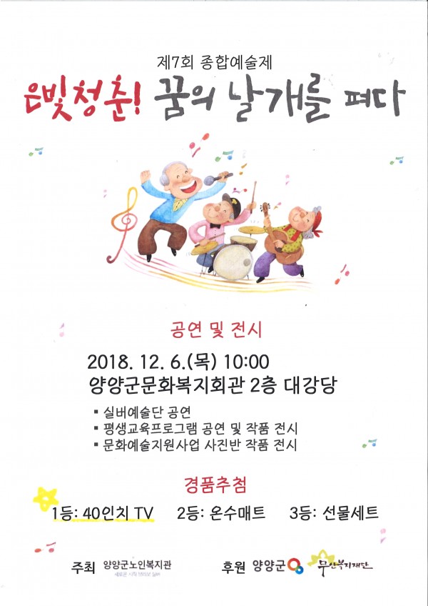 제7회 종합예술제 "은빛청춘! 꿈의 날개를 펴다" 페이지 정보 작성자 작성일18-12-04 11:03 조회537회 관련링크 이전글 다음글 목록 본문 많은 관심과 참여 부탁드립니다. 이전글 다음글 목록