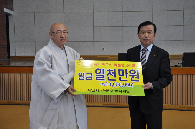 낙산사 회주 금곡 정념스님께서 정상철 양양군수님께 지역의 어렵고 소외된 어르신들을 위하여 성금을 전달하였습니다.